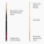 These quality ‘Silver Series’ cues by Baize Master feature a stunning single faced, stained maple front splice with a complimenting white veneer. The black 4 point ebonised butt with a high gloss finish gives this cue a real luxury feel whilst the sanded ash shaft provides a super smooth cueing action. The cue features a good quality, layered leather tip, for better cue ball control. Available in 42″ , 48″ and 52″ lengths, this range is perfect for junior players and those that prefer a shorter cue. Also a good choice for home tables with limited playing space.
